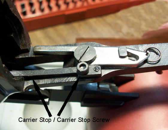 Unscrew the carrier stop screw and remove the carrier stop from underneath the
